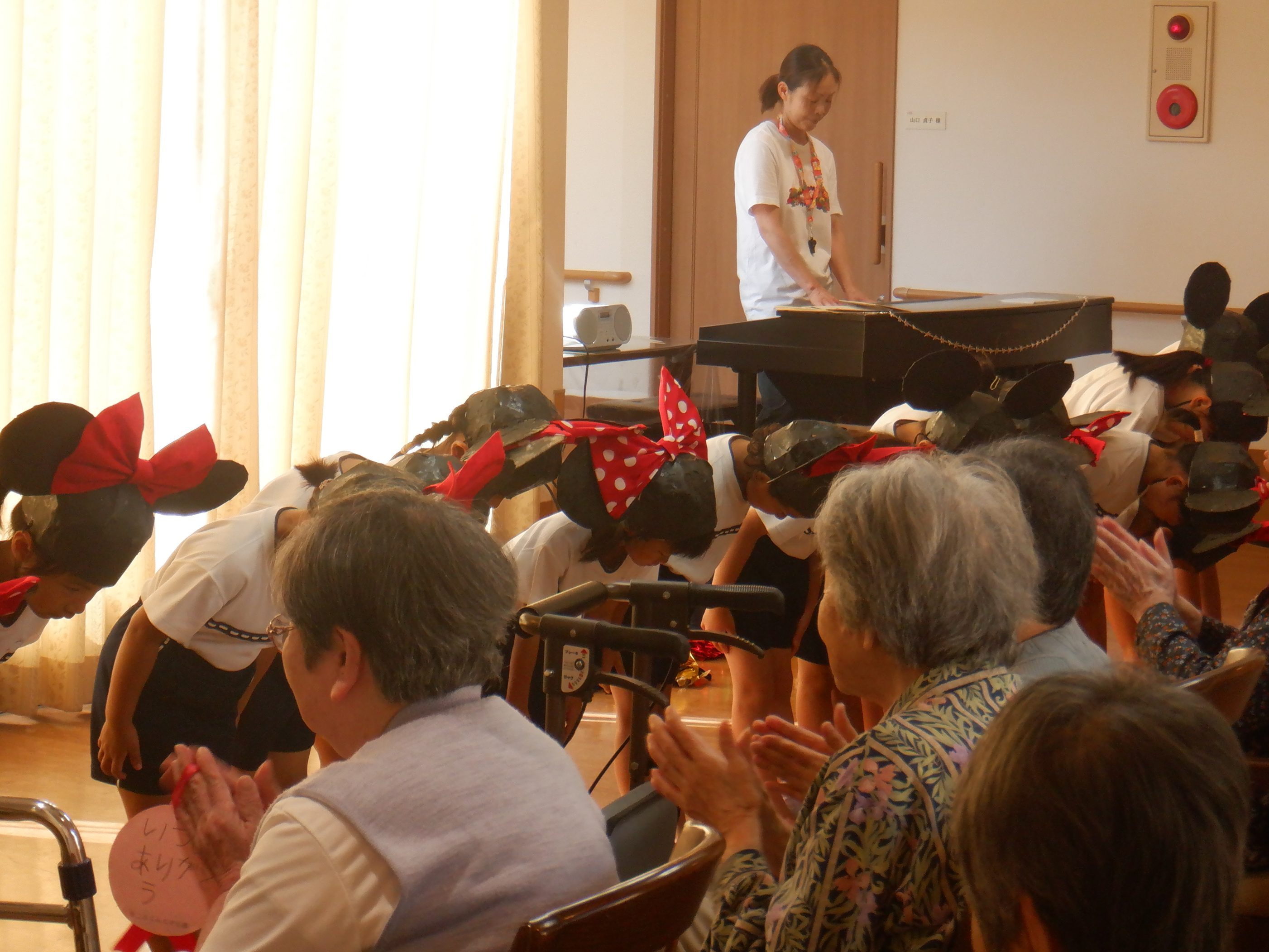 おじいちゃん、おばあちゃんに歌や踊りを見てもらいました。手作りのプレゼントを渡して、おじいちゃん、おばあちゃんと握手をしてパワーをもらった子ども達でした。
